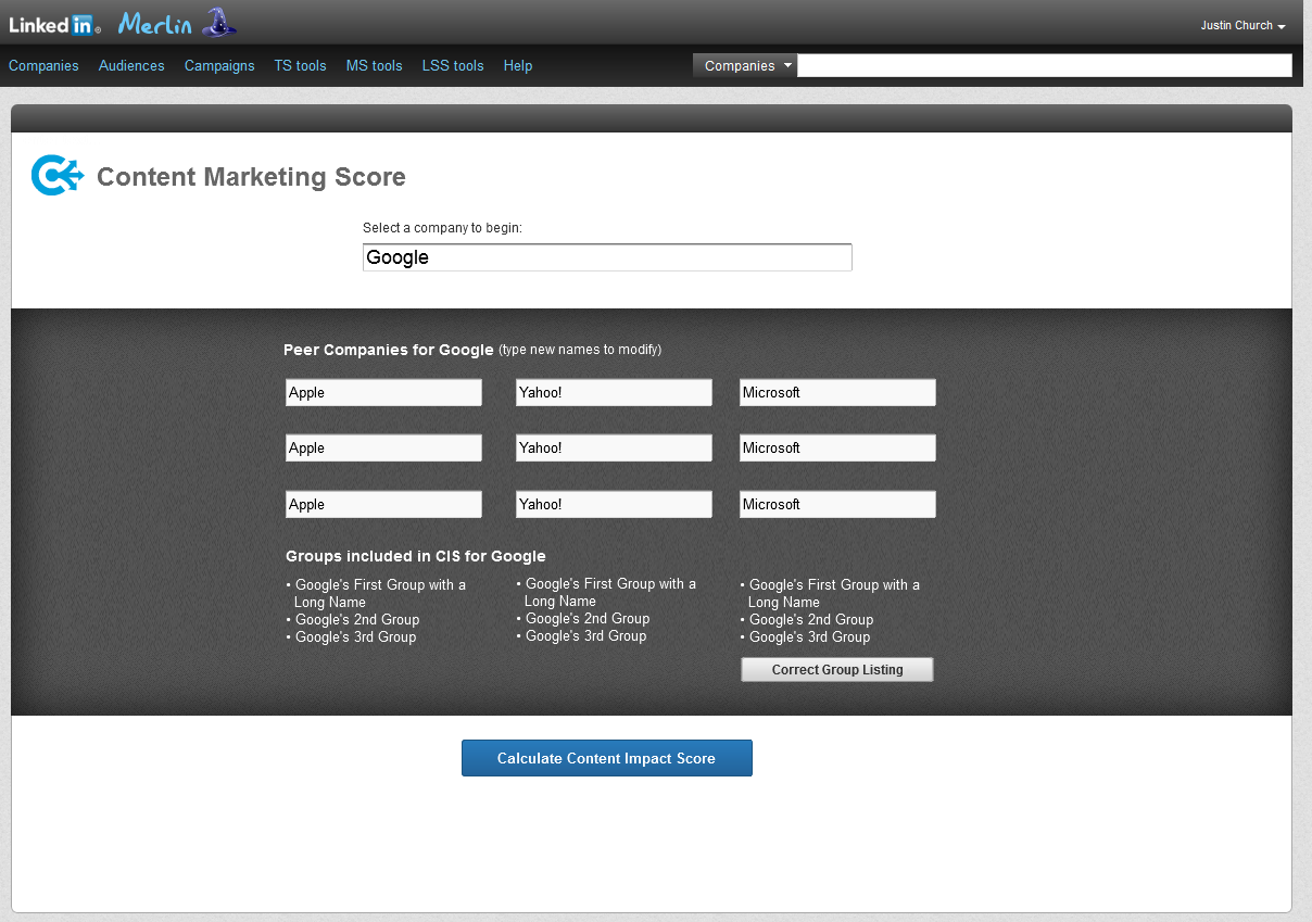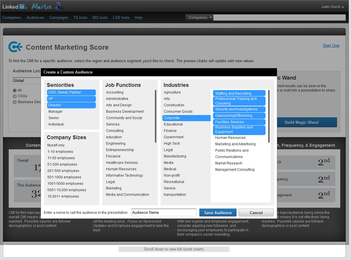 A web application that helps social marketers define success by contextualizing their performance with their peers and by seeing the results based on the actual audience they are trying to reach. By providing information about recommended next steps based on current results, sales reps are made into trusted advisors.