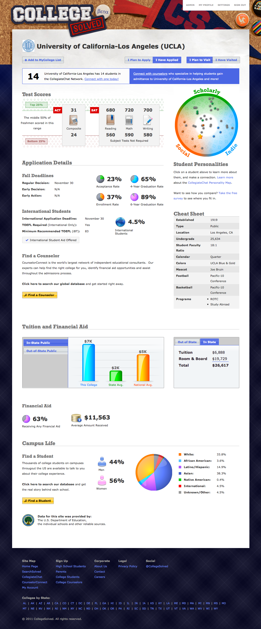 CollegeSolved.com was in an early part of their development and was reliant on government data and did not have access to reviews, user photos or other editorial content. The main challenge of this page was to lay out the data in a way that was straight forward, but used visual design to make the information seem more fun.
