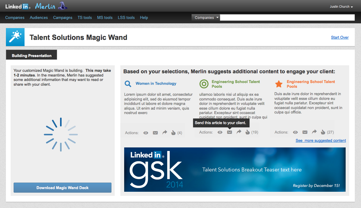 LinkedIn has a significant amount of content that would be helpful to clients; however sales reps have not been able to find content effectively. By providing both curated and crowd-sourced recommendations in a centralized location and embeddable format, the information is always where the rep can see it, at the moment it is most useful.