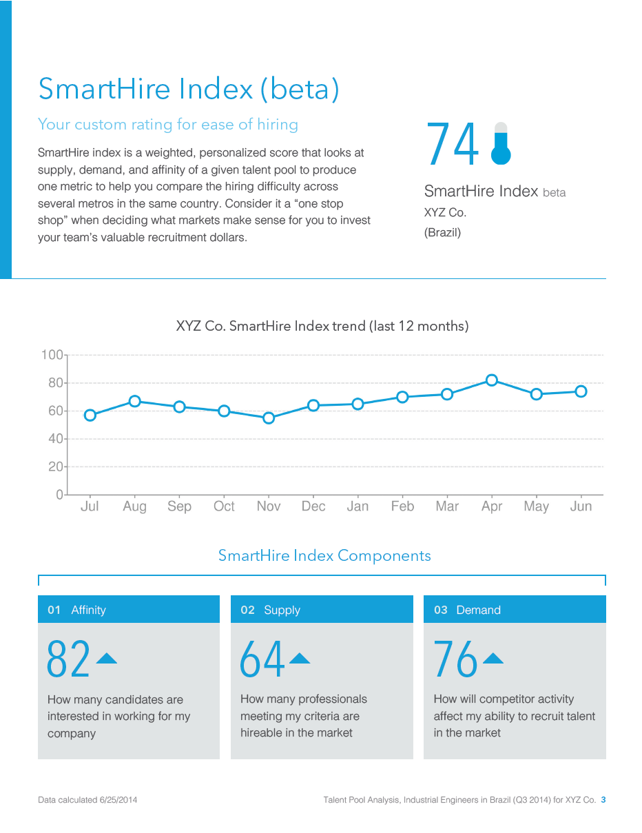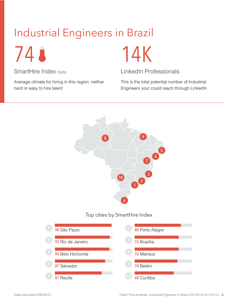 A sample page from a generated report (dummy data) that shows a client’s likely prospect of being able to hire Industrial Engineers in Brazil, as well as a ranked list of cities with the best prospects.