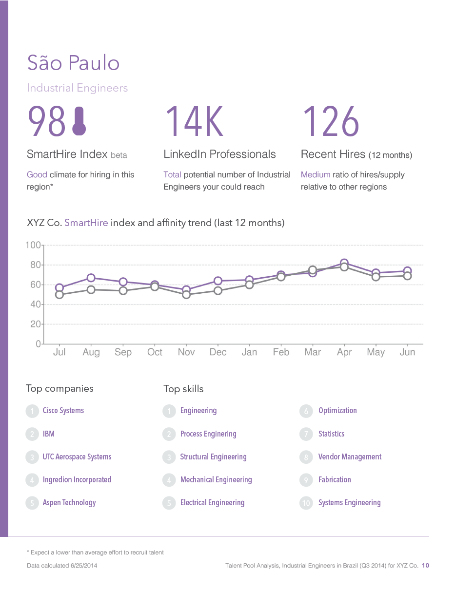 A sample city report for one of the top cities of hiring Industrial Engineers in Brazil (dummy data). Since many pages contain similar data, color is used to provide context on which section you are looking at (e.g. red is for country-level data, purple is for city-level data).